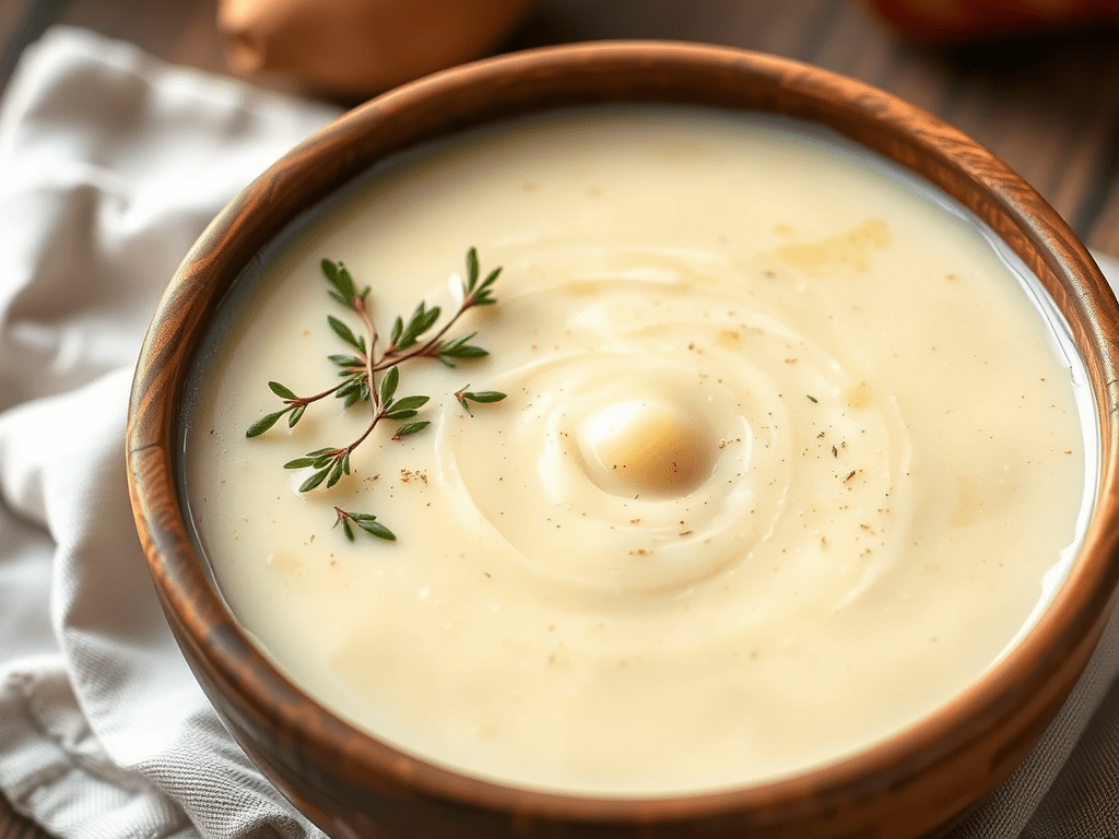 Leftover Mashed Potato Soup with Ham, sourdough bread, salad