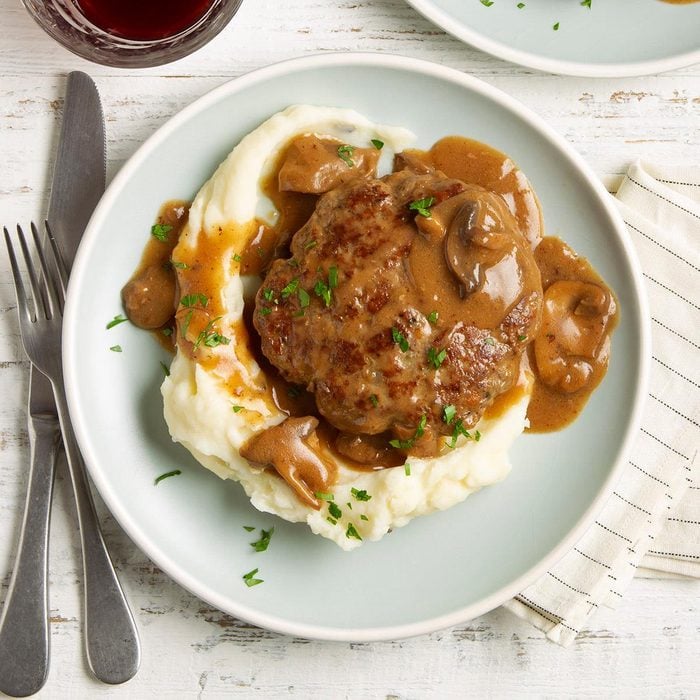 Salisbury Steak, mashed potatoes, peas