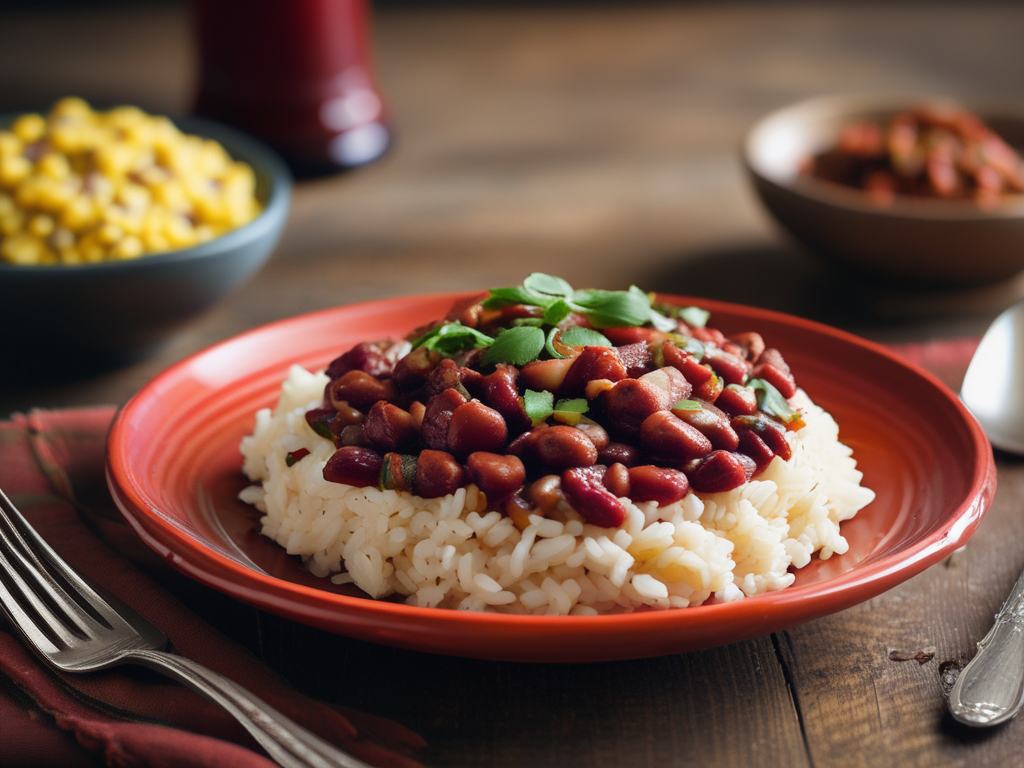 Slow Cooker Red Beans and Rice with Sausage, cornbread, Crawfish Monica, Natchitoches Meat Pies, boudin, salad, peach cobbler